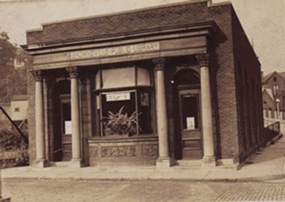 On a lot adjoining the Charles Street Bridge, which he had built over Dunlap's Creek, he decided to erect a building to house a library. The front was adorned with two pink granite columns that were take from the remodeled banking room, and, cut in stone, across the front of the building are the words, "BROWNSVILLE PUBLIC LIBRARY."